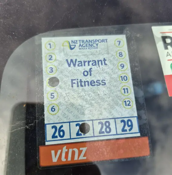 앞 유리에 붙혀주는 WOF 스티커는 만료일에 구멍을 뚫어 진다. 위의 스티커는 2027년 4월이 만료일이고, 그때가 점검 주기라는 것을 알려준다.